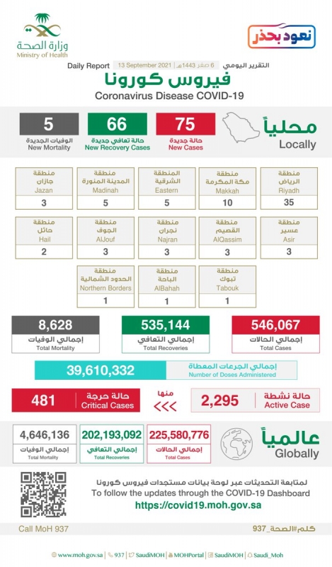 وبذلك يصل عدد إجمالي المصابين بفيروس كورونا في المملكة إلى (546067) حالة، توفي منهم (8628) حالة.