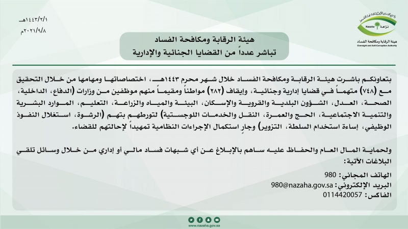 أعلنت هيئة الرقابة ومكافحة الفساد (نزاهة) أنها تباشر عدداً من القضايا الجنائية والإدارية خلال شهر محرم 1443 هـ.