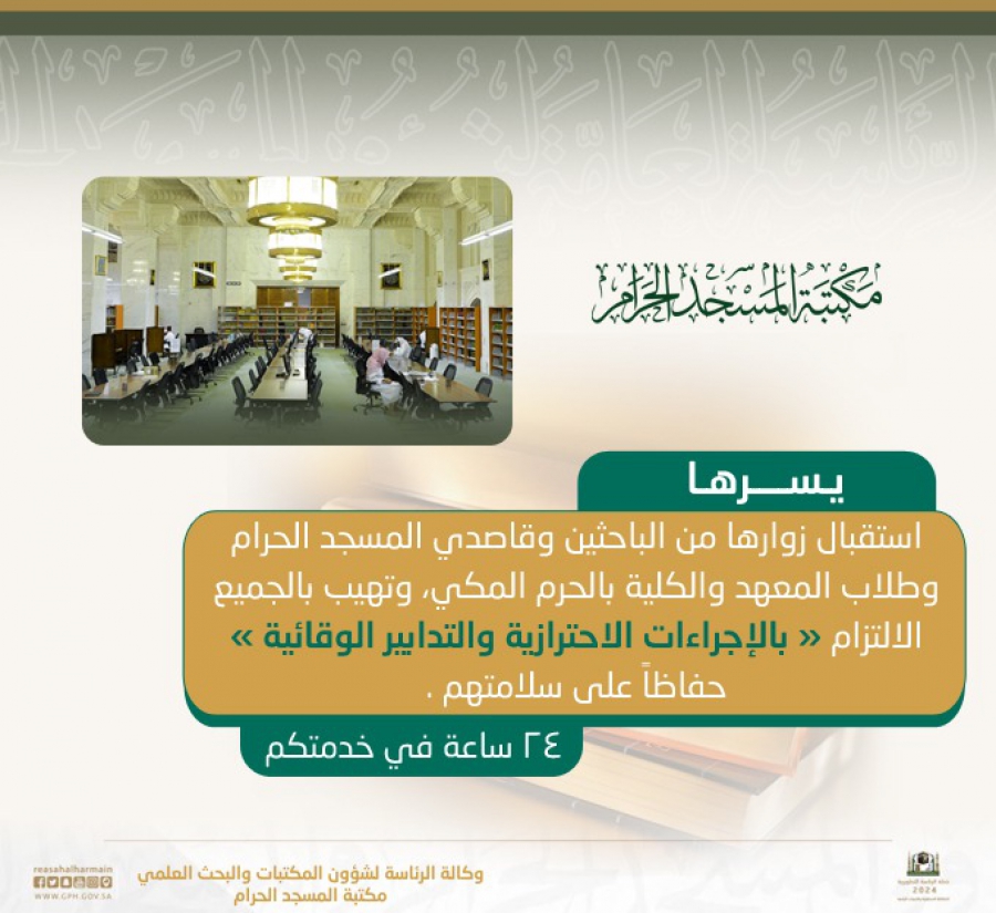 وأضاف أنه تم تهيئة مكتبة المسجد الحرام بما يتناسب مع مكانة وقدسية المسجد الحرام، وسط منظومة متكاملة من الخدمات والإجراءات الوقائية حفاظًا على سلامة المرتادين.