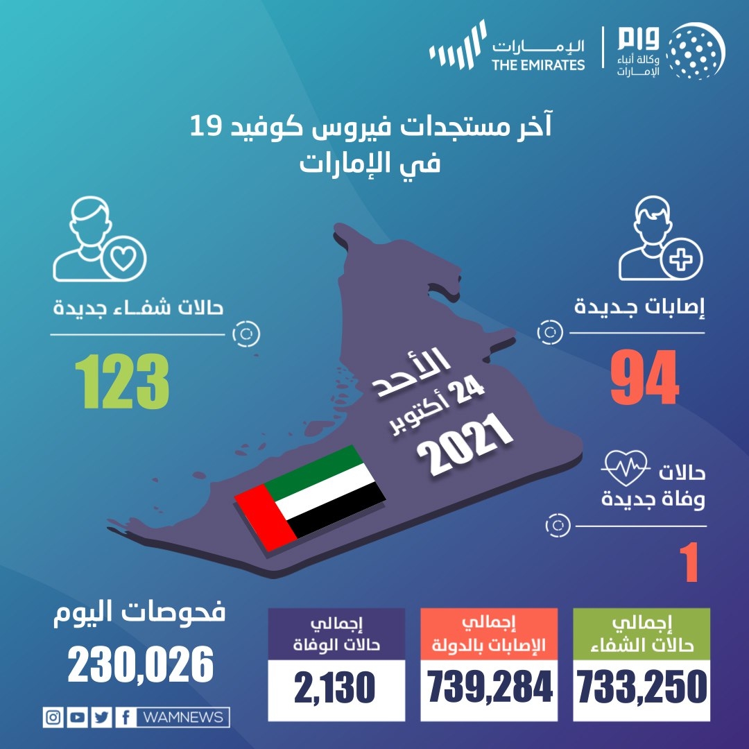 ويبلغ مجموع الحالات المسجلة 739,284 حالة فيما تم رصد حالة وفاة واحدة من تداعيات الإصابة بفيروس كورونا المستجد، وبذلك يبلغ عدد الوفيات في الدولة 2,130 حالة.