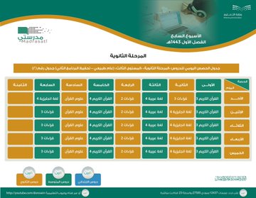 كما نشرت وزارة التعليم، جداول دروس الحصص اليومية للصفوف الرابع والخامس والسادس الابتدائي من الأسبوع السابع، وكذلك حصص التربية الخاصة، وجدول دروس الحصص اليومية للصفوف الأول والثاني والثالث المتوسط من الأسبوع السابع، عبر عين في بث مباشر من الساعة 7 صباحًا، ويُعاد طوال اليوم.