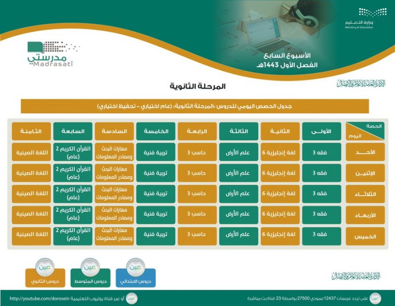 ونشرت وزارة التعليم أيضًا جدول الحصص للسنة الأولى المشتركة للمرحلة الثانوية من الأسبوع السابع، عبر قنوات عين في بث مباشر من الساعة 7 صباحًا، ويُعاد طوال اليوم، أو عبر رابط القناة على اليوتيوب، وكذلك جدول دروس الحصص اليومية للمرحلة الثانوية (المستوى الأول) من الأسبوع السابع.