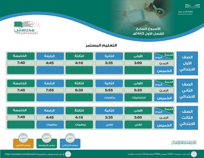 نشرت وزارة التعليم جداول دروس الحصص اليومية للصفوف الأول والثاني والثالث الابتدائي من الأسبوع السابع، عبر قنوات عين على تردد عربسات 12437، في بث مباشر من الساعة 3:30 عصرًا، ويُعاد طوال اليوم، أو عبر رابط القناة على اليوتيوب.