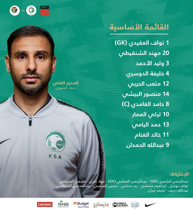 وجاء تشكيل الأخضر في مباراة السعودية ضد الأردن اليوم كالتالي؛ نواف العقيدي، مهند الشنقيطي، وليد الأحمد، خليفة الدوسري، متعب الحربي، منصور البيشي، حامد الغامدي، تركي العمار، حمد اليامي، خالد الغنام وعبدالله الحمدان.