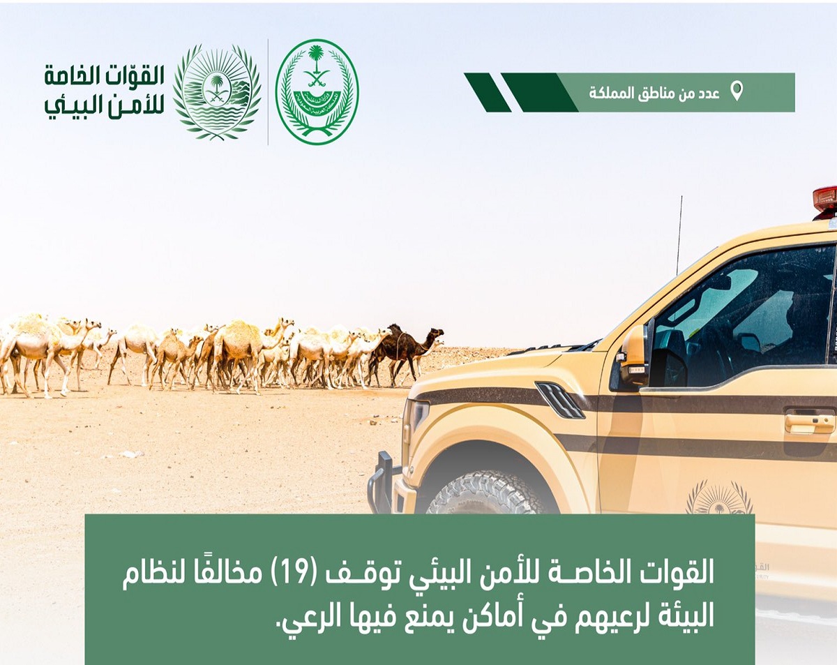 أوقفت القوات الخاصة للأمن البيئي (19) مخالفًا لـ نظام البيئة، منهم (11) مواطنًا و(8) مقيمين، من الجنسية السودانية ارتكبوا مخالفات رعي (473) رأسًا من الإبل و(395) رأسًا من الأغنام في أماكن يمنع فيها الرعي في عدد من مناطق المملكة.