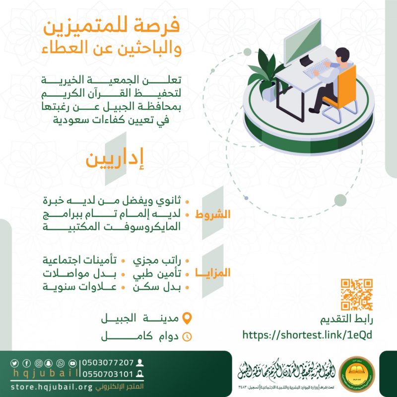 أعلنت الجمعية الخيرية لتحفيظ القرآن الكريم بالجبيل ، عبر موقعها الإلكتروني، عن توفّر وظائف إدارية شاغرة للسعوديين، من حمَلة شهادات الثانوية العامة والدبلوم والبكالوريوس في عدد من التخصصات؛ وذلك للعمل بمقر الجمعية في محافظة الجبيل الصناعية.