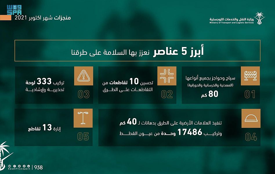 نفذت وزارة النقل والخدمات اللوجستية خلال شهر أكتوبر عددًا من الأعمال والمشروعات على الطرق التابعة لها في مناطق المملكة، بهدف رفع مستوى السلامة والجودة على الطرق وتعزيز كفاءة التشغيل.