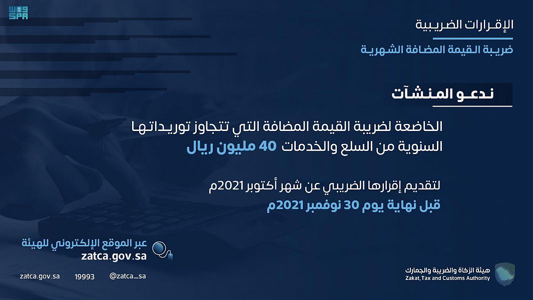 دعت هيئة الزكاة والضريبة والجمارك المكلفين من قطاع الأعمال الخاضعين لضريبة القيمة المضافة إلى تقديم إقراراتهم الضريبية عن شهر أكتوبر الماضي، وذلك في موعدٍ أقصاه الثلاثين من شهر نوفمبر الجاري.