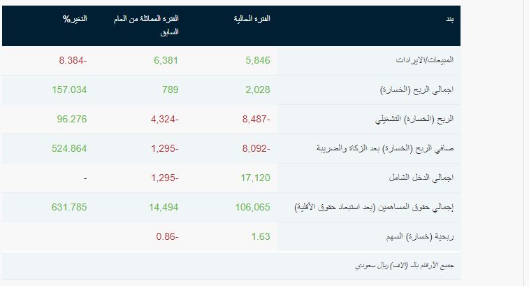وقالت الشركة إن السبب في تحقيق أرباح في الربع الحالي مقارنة بالربع السابق والربع المماثل من العام السابق يعود إلى مكاسب استبعاد أصول العمليات المتوقفة وتحقيق ربح 24.6 مليون ريال ببيع أصول مشروع الجوف خلال الربع الحالي كما أن هناك زيادة في المبيعات بنسبة 30٪ وانخفاض تكلفة المبيعات للربع الحالي بنسبة 42٪ مما أثر بشكل إيجابي على تحقيق إجمالي ربح الربع الحالي مقارنة بإجمالي الخسارة للربع المماثل من العام السابق، إضافة إلى ارتفاع المصاريف العمومية والإدارية نتيجة زيادة تكاليف الموظفين ، ما أدى إلى ارتفاع الخسارة التشغيلية للربع الحالي مقارنة بالربع المماثل من العام السابق.