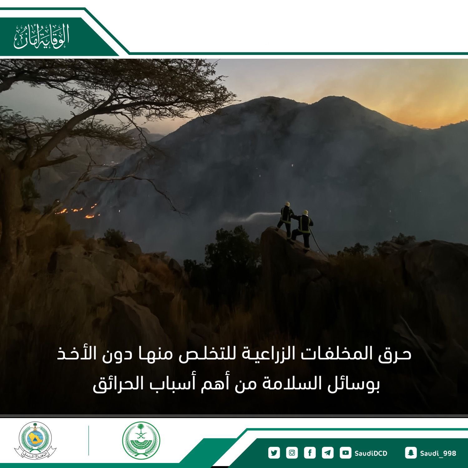 حذر الدفاع المدني من حرق المخلفات الزراعية للتخلص منها دون الأخذ بوسائل السلامة مؤكدًا أن ذلك من أهم أسباب الحرائق.