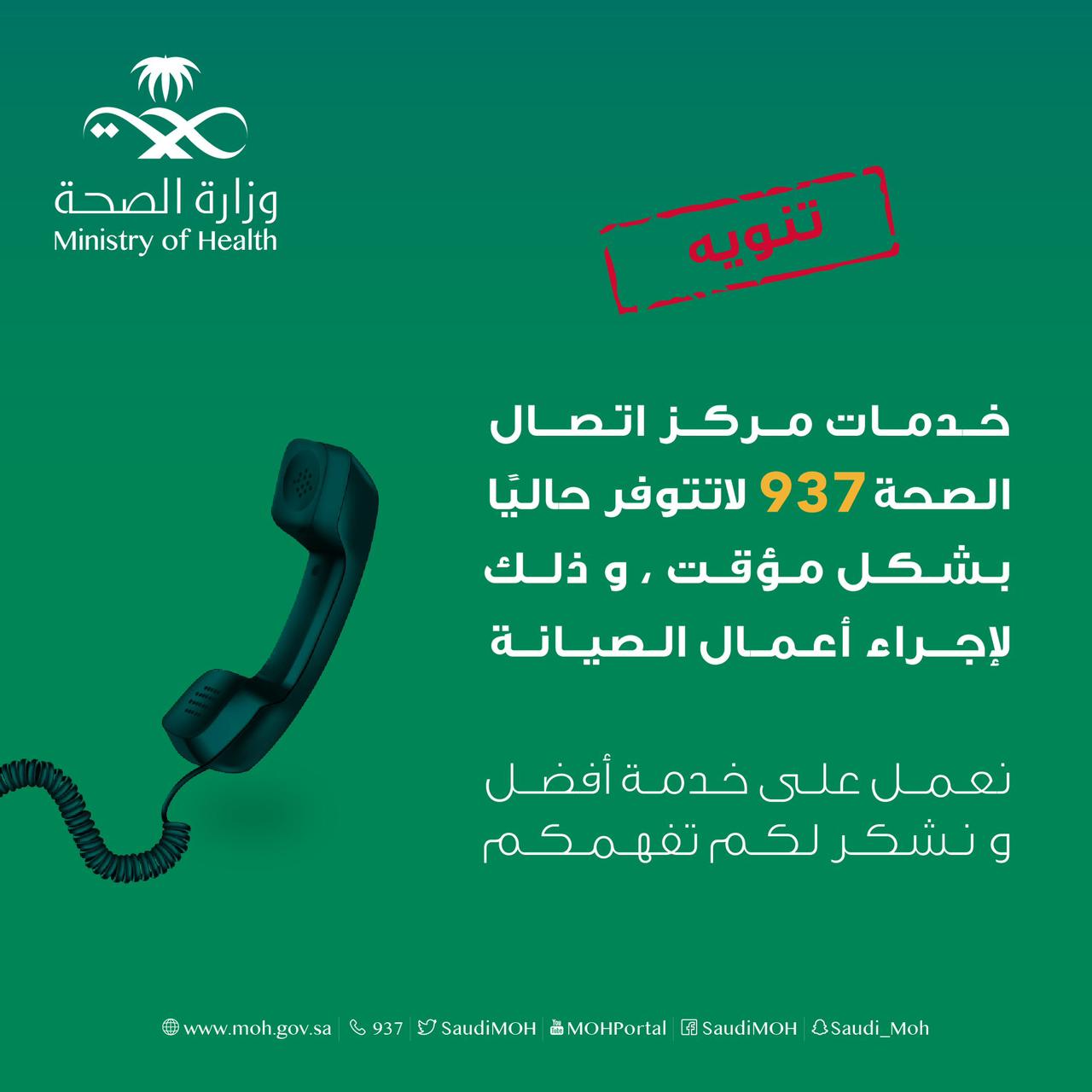 وأوضحت الصحة في تغريدة لها عبر حسابها الرسمي بموقع تويتر، أن عدم توفر الخدمات على 937 يعود إلى إجراء أعمال الصيانة، مشددًا على أنها تعمل على خدمة أفضل، شاكرة تفهم الجميع.