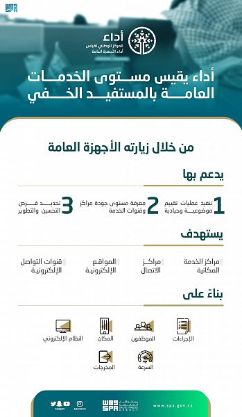 يعمل المركز الوطني لقياس أداء الأجهزة العامة “أداء” لدعم عمليات تحسين الخدمات الحكومية وتطويرها، عبر أداة “المستفيد الخفي”، وهي من أدوات القياس المعتمدة من المركز لقياس رضا المستفيد عن الخدمات الحكومية المقدمة، من خلال قياس امتثال مراكز وقنوات الخدمة التابعة للأجهزة العامة بمختلف أنواعها، كمراكز الخدمة المكانية، ومراكز الاتصال، والمواقع الإلكترونية، وقنوات التواصل الإلكتروني، بمعايير معينة تختلف من قطاع إلى آخر، وتستند على أفضل التجارب والممارسات العالمية في هذا المجال.