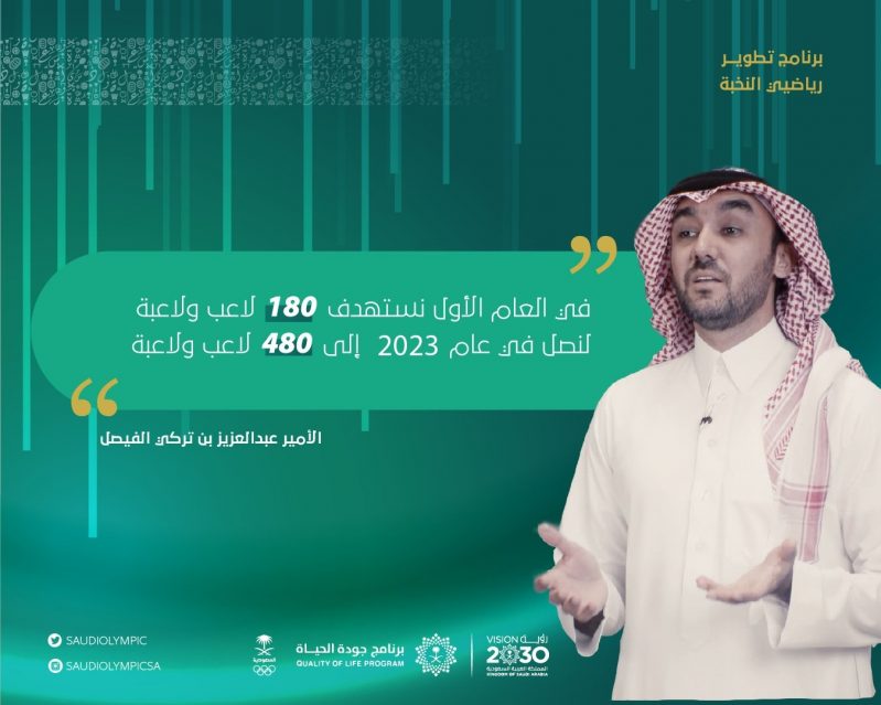 وأشار الأمير عبدالعزيز بن تركي الفيصل إلى أن برنامج تطوير رياضيي النخبة يستهدف إلى رفع عدد رياضيي النخبة بنسبة 260% لنصل في عام 2023 إلى 480 لاعبًا ولاعبة، وفي العام الأول 2021 يهدف إلى 180 لاعبًا ولاعبة.