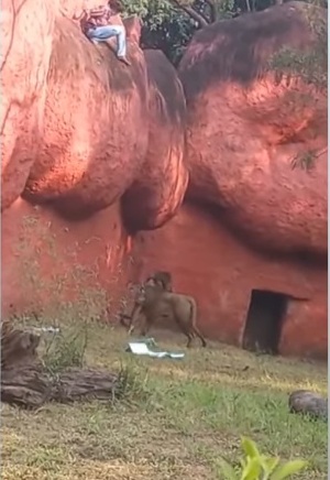 ويظهر الرجل في الفيديو داخل المنطقة المخصصة للأسود بإحدى حدائق الحيوانات، ويجلس على منطقة مرتفعة تحسبًا لأي هجمة مفاجئة من الأسد.