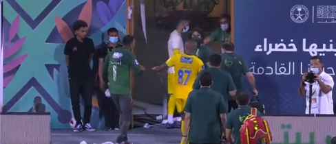 ونقلت قناة SSC، الناقل الحصري لـ الدوري، لقطة إصابة أمين بخاري في رأسه حيث أُلقيت عليه الزجاجة وهو خارج من ملعب الأمير فيصل بن فهد “الملز” في الرياض من أحد الجماهير المتواجد في المدرجات.
