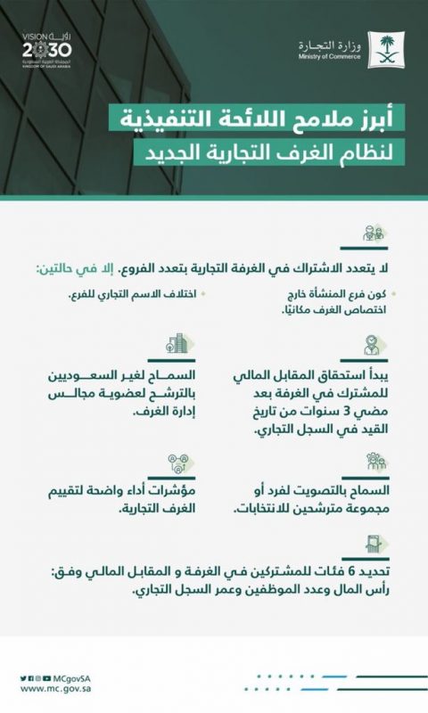 وتضمن  النظام الجديد للغرف التجارية عددا من المزايا من أهمها  وضع معايير لتقويم أداء الغرف التجارية، ونشر نتائج التقييم المعتمدة على الموقع الإلكتروني للغرفة،  وتعزيز الشراكة بين القطاع العام والخاص، وتشكيل كيانات مؤسسية بمعايير عالمية، ومتابعة وتطوير أداء الكيانات التجارية. هذا ويتم التصويت لانتخابات الغرف التجارية الكترونيا عبر الرابط