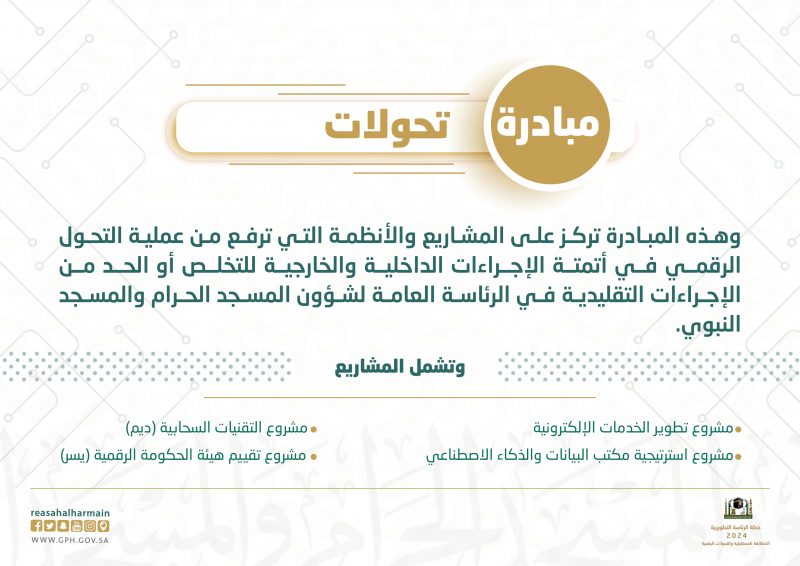 أطلقت الرئاسة العامة لشؤون المسجد الحرام والمسجد النبوي، ممثلة في وكالة الشؤون التقنية والتحولات الرقمية والذكاء الاصطناعي، 3 مبادرات نوعية بهدف تجويد مخرجات الأعمال بما يتناسب مع خطة الانطلاقة المستقبلية والتحولات الرقمية (2024) وهي مبادرة (ذكاء) ومبادرة (تحولات) ومبادرة (تقانة).