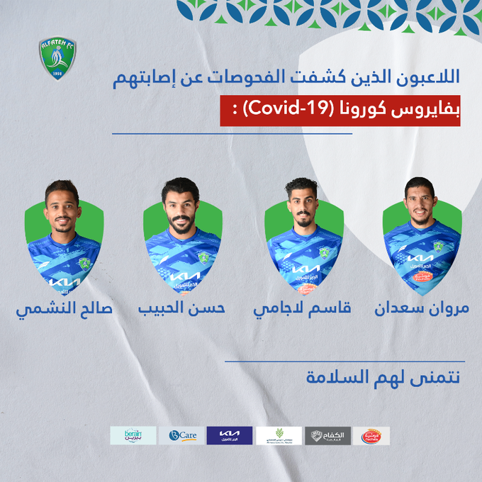 وأُصيب كل من المغربي مروان سعدان وقاسم لاجامي وصالح النشمي وحسن الحبيب بفيروس كورونا.