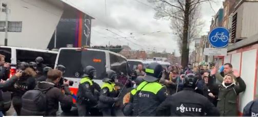 وذكر المراسلون الذين تواجدوا في موقع التظاهر بساحة المتحف في أمستردام، أن الشرطة اعتقلت شخصًا واحدًا على الأقل، فيما أظهر مقطع فيديو متداول كلبًا بوليسيًّا وهو ينهش ذراع أحد المتظاهرين لدى قيام الشرطة بتفريق المحتجين.