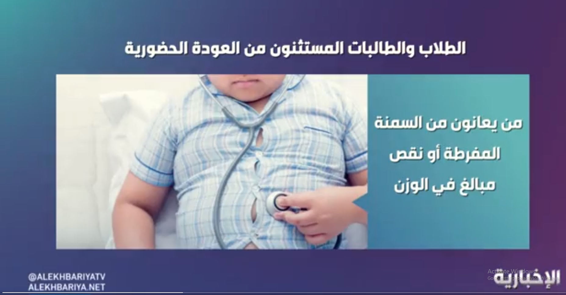 وبحسب فيديو نشرته قناة الإخبارية، يستثنى من الحضور الطلاب المصابون بمرض السكري من النوع الأول، ومن يعانون من السمنة المفرطة أو نقص مبالغ في الوزن، المصابون بأمراض القلب وتصلب الشرايين والأوعية الدموية.