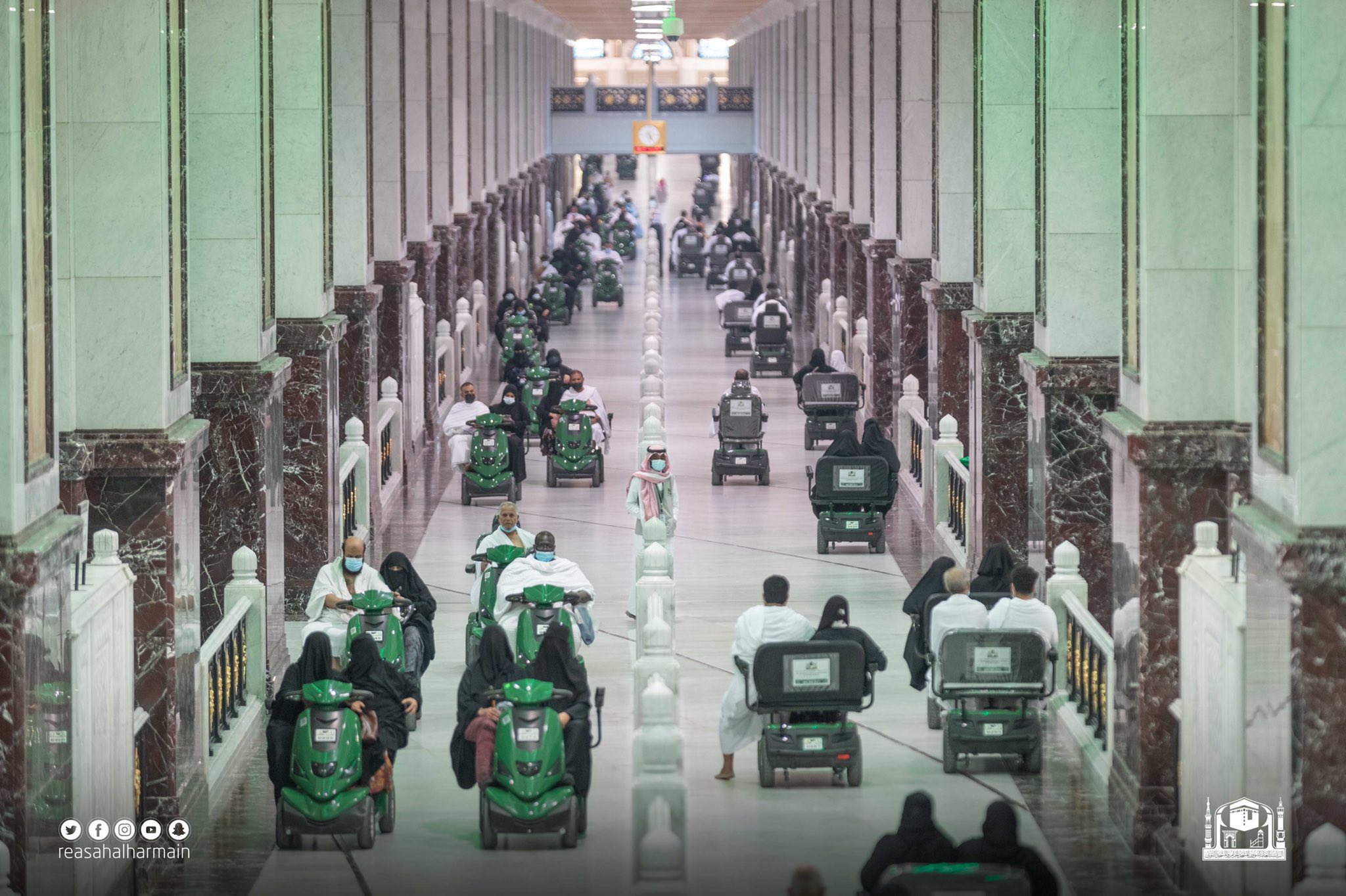 وأشار إلى أنه يتم عبر إدارة خدمات التنقل توفير عربات كهربائية وعادية لخدمة قاصدي البيت الحرام، وكذلك الإشراف على دافعي العربات الخاصة، وتمنحهم تصاريح العمل بعد استيفاء الشروط اللازمة للحصول على التصريح، وتتابعهم ميدانياً لضمان التزامهم بالتعليمات، وضبط الأسعار لمنع استغلال المستفيدين من الخدمة في زيادة أسعار الخدمة المقدمة، حيث تعمل على مدار الساعة بنظام الورديات وتأمين مراقبين على الأبواب البالغ عددها (٥١) باباً حيث يقومون بتنفيذ التعليمات الخاصة بالأبواب، ومنها عدم دخول الأمتعة والأطعمة والآلات الحادة وخلافه، مما يساعد على بقاء المسجد الحرام نظيفًا تؤدى فيه العبادة براحة واطمئنان.