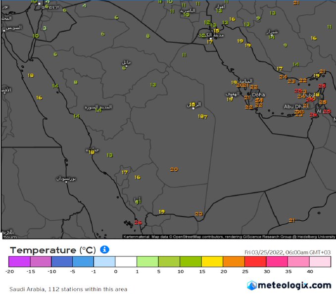 وكان المركز الوطني للأرصاد توقع اليوم أن تكون السماء غائمة جزئيًا إلى غائمة مع فرصة لهطول أمطار متفرقة مصحوبة برياح نشطة مثيرة للأتربة والغبار على أجزاء من منطقتي الجوف والحدود الشمالية يلي ذلك انخفاض في درجات الحرارة يمتد إلى أجزاء من وسط وشرق المملكة.