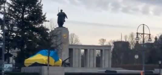وأظهرت لقطات فيديو مصورة، دبابة T-34 تقف عند النصب التذكاري للقوات السوفيتية في برلين مغطاة بالعلم الأوكراني.