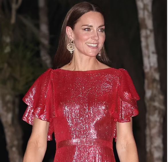 وارتدت كيت فستانًا ورديًا متلألئًا تبلغ قيمته 2500 جنيه إسترليني من تصميم ” The Vampire’s Wife “وأكملت إطلالتها بصندل فضي بكعب.