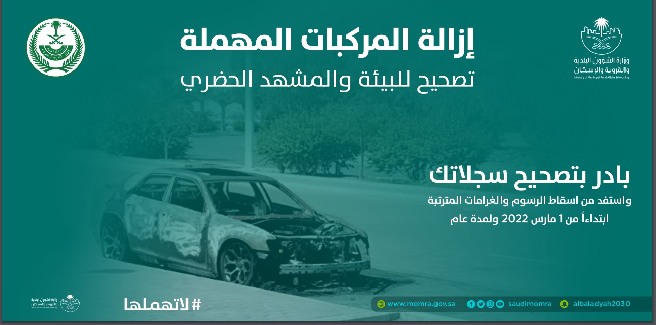دعت وزارة الشؤون البلدية والقروية والإسكان والإدارة العامة للمرور أصحاب المركبات المهملة أو التالفة داخل الأحياء السكنية في مدن ومحافظات المملكة إلى المبادرة بإزالتها وإسقاطها من سجلاتهم لدى الإدارة العامة للمرور، وذلك بالاستفادة من المهلة التصحيحية التي بدأت يوم الثلاثاء الأول من مارس 2022، بهدف تحسين المشهد الحضري ورفع جودة الحياة داخل المدن بيئياً وأمنياً تحقيقاً لمستهدفات برامج رؤية المملكة 2030.