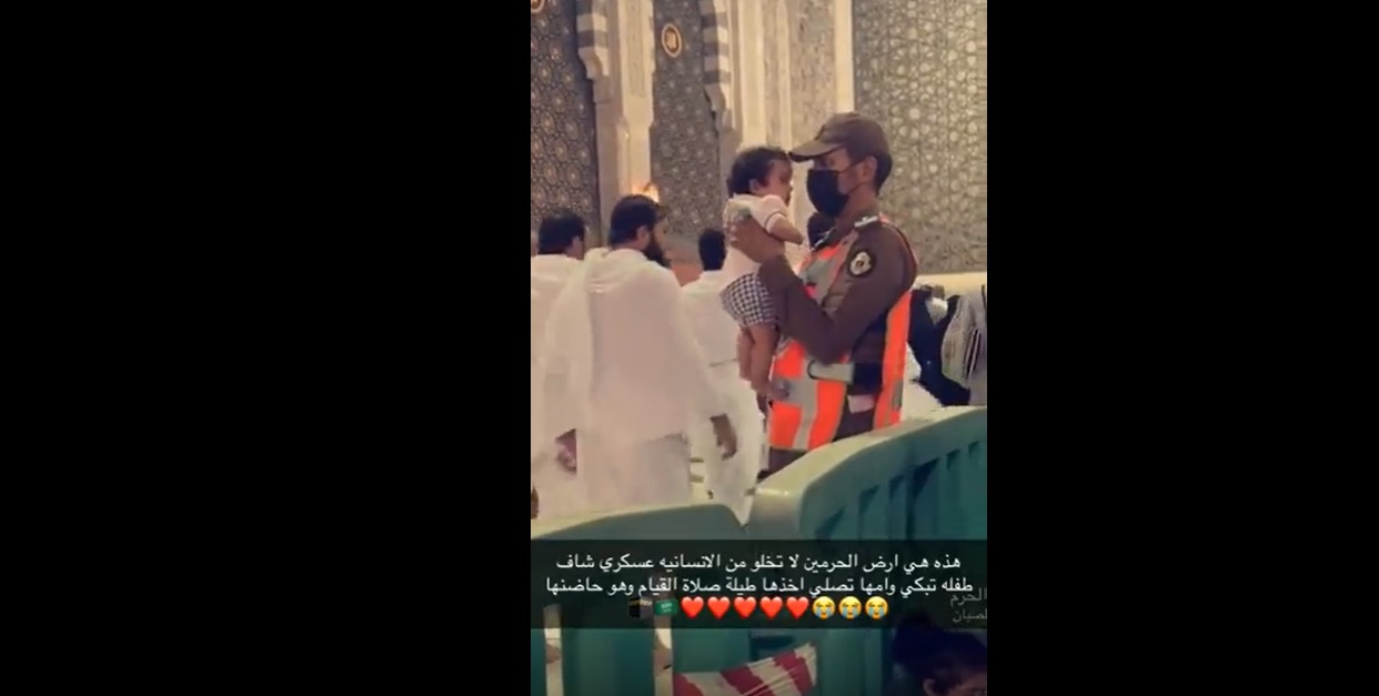 أظهر مقطع فيديو موقفًا إنسانيًّا من جندي في الحرم المكي، تجاه طفلة لا يتجاوز عمرها عامين.