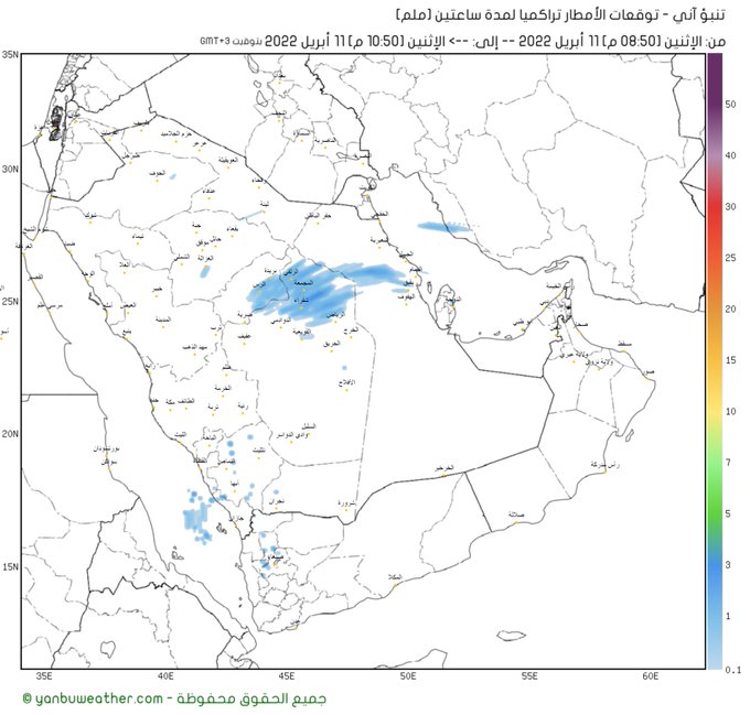 ونشر المسند إحدى خرائط الطقس لتوقعات الأحوال الجوية وعلق عليها بالقول : زخات مطرية متوقعة خلال الساعتين القادمتين من 08:50 حتى 10:50م.