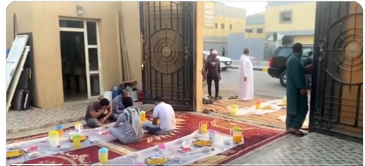 وأظهر مقطع فيديو بثته قناة الإخبارية المواطن وهو يدعو العمال والمارة إلى بيته لتناول وجبة الإفطار فيما تم مد السفر على مساحات واسعة من الأرض.