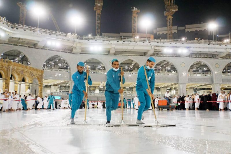 وأكد وكيل الرئيس العام للخدمات والشؤون الميدانية وتحقيق الوقاية البيئية، محمد بن مصلح الجابري، أن وكالة الرئاسة العامة للخدمات والشؤون الميدانية وتحقيق الوقاية البيئية تقوم بتطهير كل موقع على حدة، حيث تتضمن أعمال تطهير المسجد الحرام غسيل صحن المطاف والساحات الخارجية، باستخدام تشغيل معدات غسيل مخصصة لعملية التنظيف في الساحات ومعدات مخصصة للمسجد من الداخل، وإخراج (300) طن من المخلفات إلى خارج المسجد الحرام بواسطة السيارات الكهربائية مخصصة.