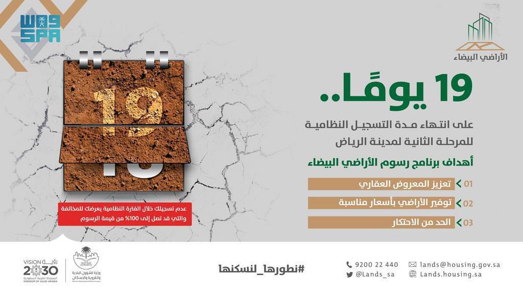 وأضاف: “جميع ملاك الأراضي البيضاء الواقعة داخل النطاقات الجغرافية للمدن -التي يُطبق فيها رسوم الأراضي البيضاء- مطالبين بتسجيل أراضيهم عبر البوابة الإلكترونية بما في ذلك ملاك الأراضي البيضاء المطورة في مدينة الرياض، وذلك قبل انتهاء مهلة التسجيل النظامية للمرحلة الثانية بعد 19 يوما”.