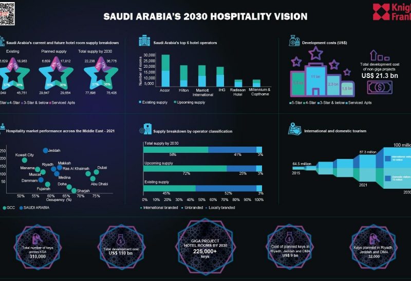 وتهدف المملكة إلى إضافة 310 آلاف غرفة فندقية ضمن طموحات رؤية 2030، ويأتي ذلك بتكلفة تصل إلى 110 مليارات دولار، وفقًا لتحليل شركة نايت فرانك.