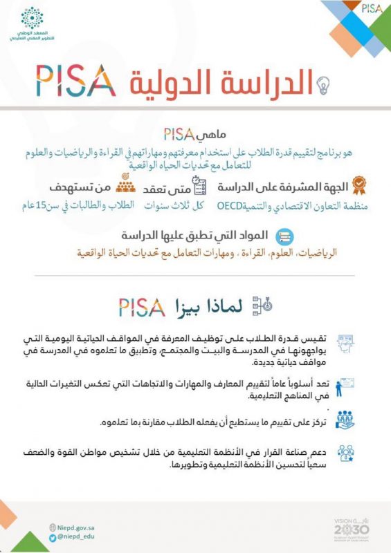 ضمن المشروعات التطويرية لشاغلي الوظائف التعليمية للمعهد الوطني للتطوير المهني التعليمي، ينطلق برنامج التطوير المهني لتعزيز المهارات الأساسية المستهدفة في البرنامج الدولي لتقييم الطلبة PISA لمجال الرياضيات والعلوم والقراءة .