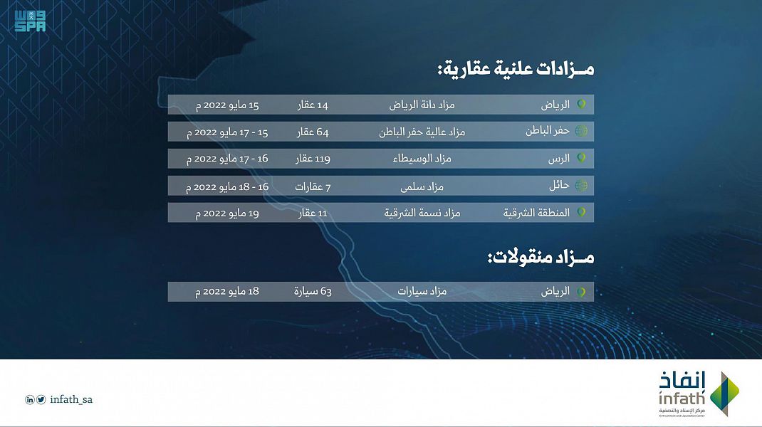 أعلن مركز الإسناد والتصفية “إنفاذ” عن إقامة 6 مزادات علنية، تعرض عقارات ومنقولات في 5 مدن ومحافظات بمختلف مناطق المملكة، وذلك في الفترة ما بين 15 إلى 19 مايو 2022م.