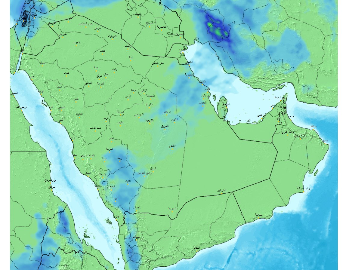 وكان المركز توقع في تقريره عن حالة الطقس لهذا اليوم – بمشيئة الله تعالى – استمرار تأثير الرياح النشطة المثيرة للأتربة والغبار تحد من مدى الرؤية الأفقية على أجزاء من مناطق الحدود الشمالية، الجوف، حائل، القصيم، الرياض والشرقية كذلك على أجزاء من منطقتي مكة المكرمة والمدينة المنورة في حين لاتزال الفرصة مهيأة لهطول أمطار رعدية مصحوبة بزخات من البرد ورياح نشطة على أجزاء من مرتفعات مناطق جازان، عسير والباحة ولا يستبعد تكون السحب الرعدية الممطرة على أجزاء من وسط وشرق المملكة.