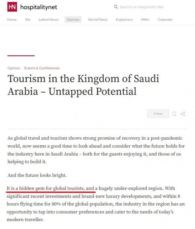 وقال الموقع: من المنصف أن نقول إن السعودية تستعد لمستقبل مشرق عندما يتعلق الأمر بالسفر العالمي، مع الوضع في الاعتبار أن السياحة بشكل عام هي صناعة جديدة ومثيرة للمملكة، مع إمكانية تحقيق فوائد اقتصادية واجتماعية وبيئية ضخمة كجزء من خطط أوسع لتنويع اقتصادها بما يتماشى مع خطط رؤية 2030 الطموحة.