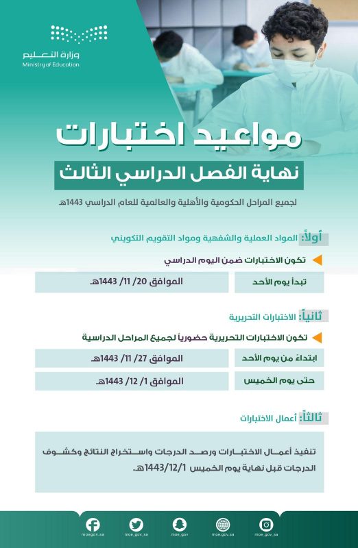 اعتمدت وزارة التعليم تنظيم أعمال اختبارات نهاية الفصل الدراسي الثالث 1443هـ لجميع مراحل التعليم العام الحكومي والأهلي والعالمي، ومعاهد وبرامج التربية الخاصة، والتعليم المستمر، حيث يبدأ الطلاب والطالبات أداء اختبارات المواد العملية والشفهية ومواد التقويم التكويني اعتباراً من الأحد 20 ذي القعدة، على أن تكون ضمن اليوم الدراسي.