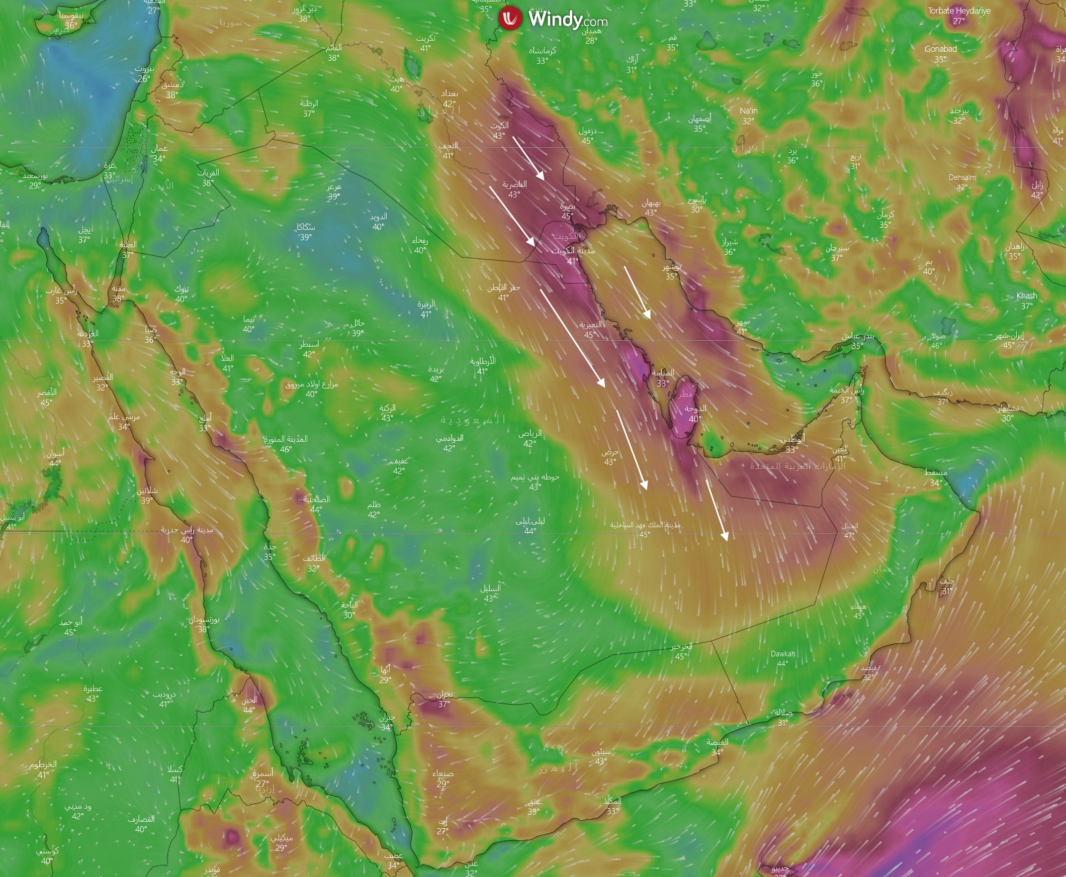 توقع أستاذ المناخ سابقًا الدكتور عبدالله المسند أن تنشط رياح البوارح الجافة والحارة على المنطقة الشرقية وعدد من دول الخليج اليوم ما يسبب ارتفاع درجات الحرارة مع الأتربة المثارة.