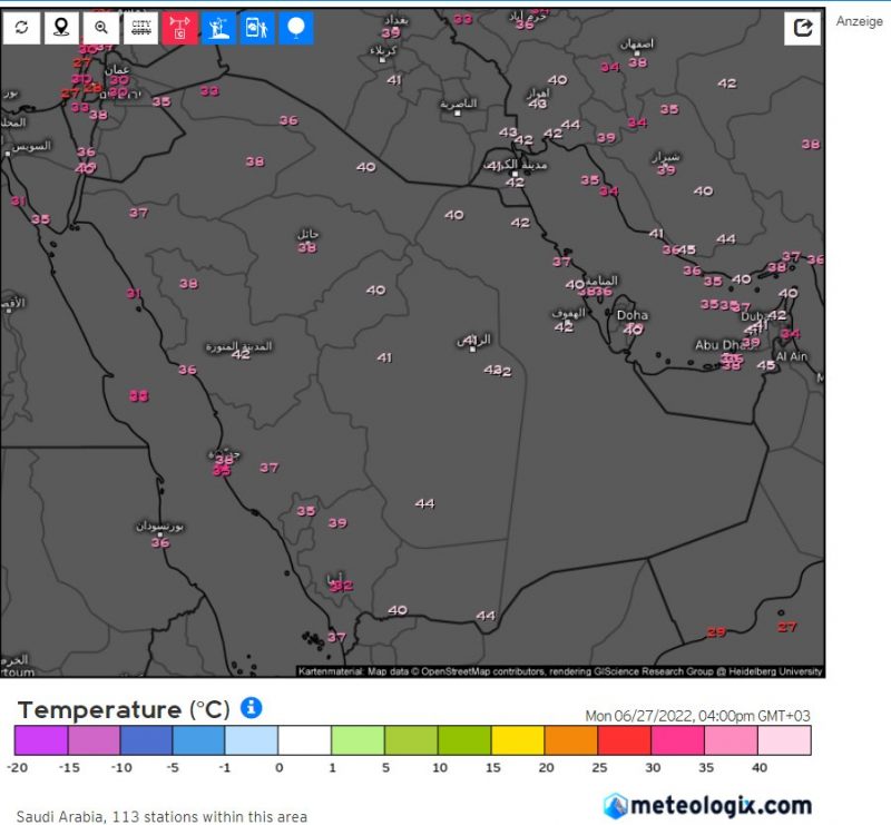 وقال الباحث في الطقس عبد العزيز الحصيني : الحرارة الساعة”4″ عصر اليوم الاثنين 28 ذي القعدة على معظم مناطق المملكة والخليج أخف من الأيام الماضية ولله الحمد”.