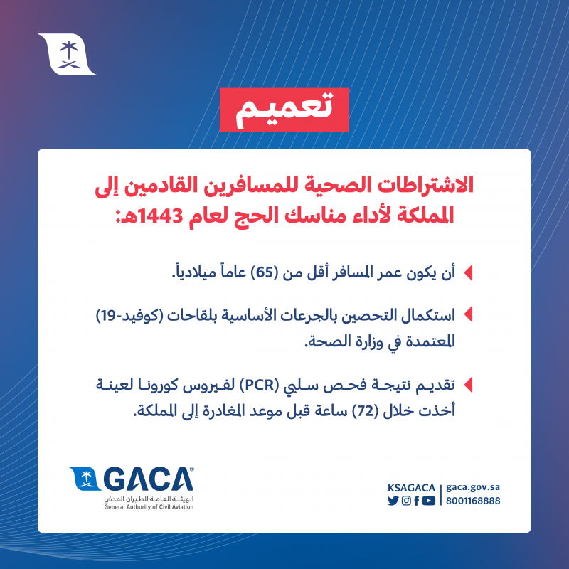 ونص التعميم أنه يجب على جميع شركات الطيران بنقل مسافرين قادمين إلى المملكة لغرض أداء مناسك الحج لعام 1443هـ الالتزام والتقيد بالإجراءات التالية: أن يكون المسافر أقل من (65) عاماً ميلادياً، وأن يستكمل التحصين بالجرعات الأساسية بلقاحات (كوفيد_19) المعتمدة في وزارة الصحة، وأن يقدم نتيجة فحص سلبي (PCR) لفيروس كورونا (كوفيد_19) لعينة أخذت خلال (72) ساعة قبل موعد المغادرة إلى المملكة.