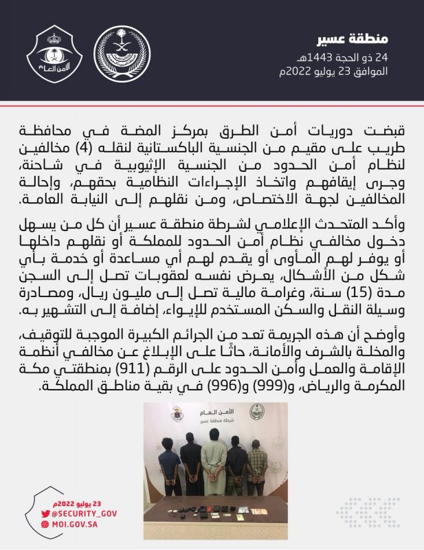 وأكدَ المتحدثُ الإعلاميُّ لشرطة منطقة عسير أنَّ كلَّ من يسهلُ دخولَ مخالفي نظام أمن الحدود للمملكة أو نقلهم داخلها أو يُوَفِّرُ لهم المأوى أو يُقَدِّمُ لهم أيَّ مساعدة أو خدمة بأي شكل من الأشكال، يُعَرِّضُ نفسَه لعقوبات تصلُ إلى السجن مدة (15) سنة، وغرامة مالية تصلُ إلى مليون ريالٍ، ومصادرة وسيلة النقل والسكن المستخدم للإيواء، إضافةً إلى التشهير به.