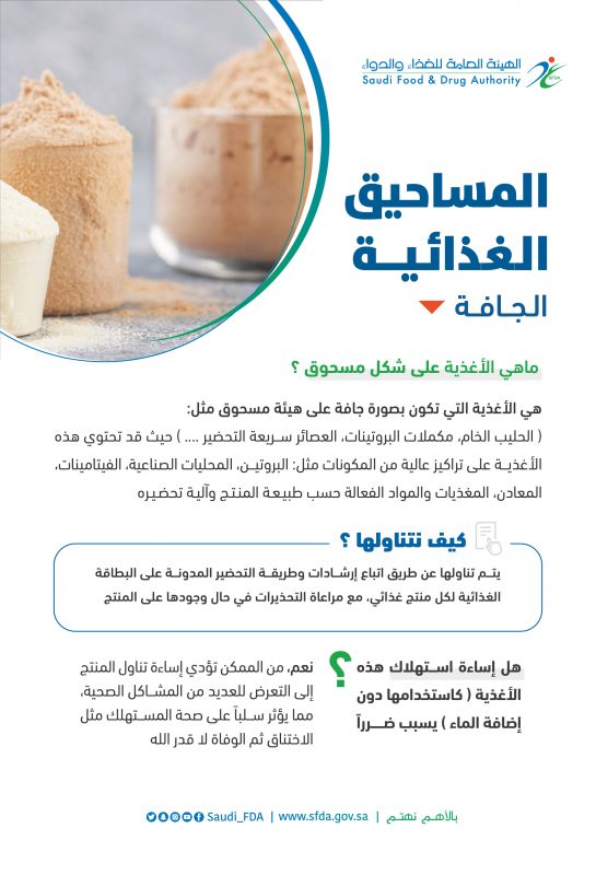 نبهت الهيئة العامة للغذاء والدواء بالحرص في استهلاك الأغذية الجافة على شكل مسحوق، مشيرة إلى أن لكل منتج غذائي على شكل مسحوق طريقة تحضير مدونة على عبوته، حيث إن اتباعها يجنب الإنسان سوء استخدامها وحدوث الضرر.