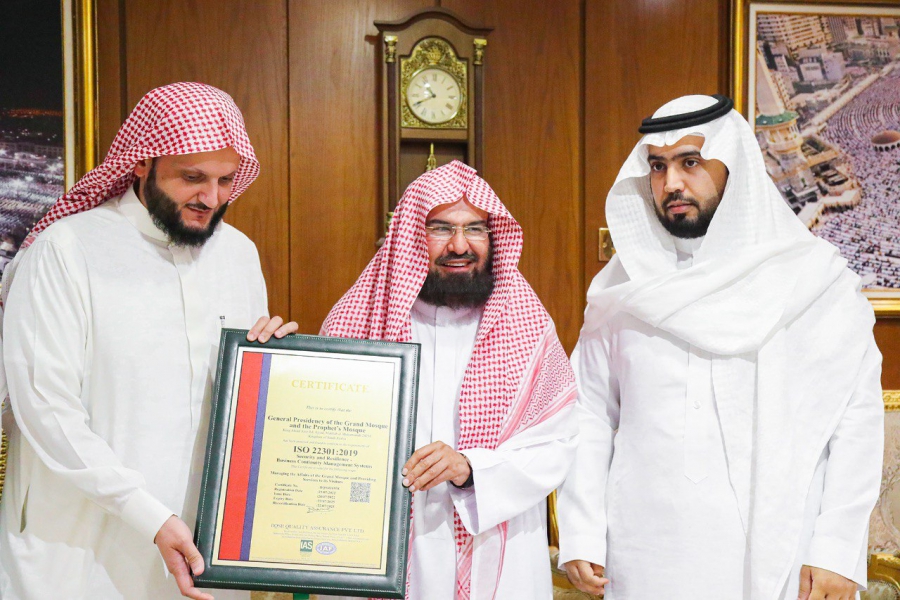 تسلَّم الرئيس العام لشؤون المسجد الحرام والمسجد النبوي، الشيخ عبدالرحمن بن عبدالعزيز السديس، اليوم الأحد، بمكة المكرمة، شهادة الآيزو لنظام استمرارية الأعمال (iso 22301).