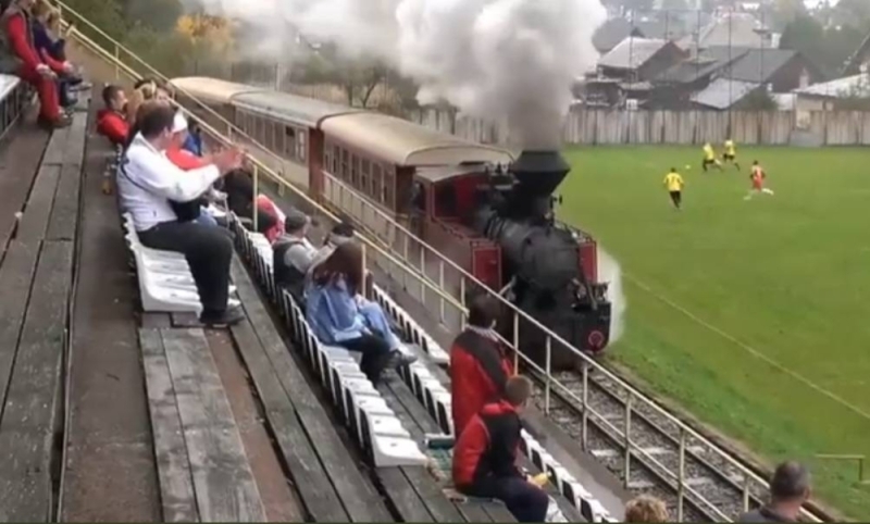 أظهر مقطع فيديو متداول أغرب خط حديدي على مستوى العالم إذ يمر مساره في أحد الملاعب الرياضية، في سلوفاكيا.