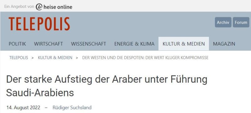 قال موقع Heise الألماني إن العرب يشهدون صعودًا قويًا سياسيًا واقتصاديًا تحت قيادة المملكة العربية السعودية، وذلك في مقابل هبوط ملحوظ بل وفشل في السياسة الخارجية ومبادئ الغرب.
