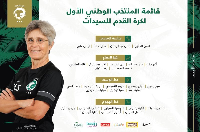 واستدعت مونيكا ستاب 27 لاعبة لمعسكر أخضر السيدات، وهن؛ لمى العنزي، منى عبدالرحمن، سارة خالد، ليلى علي، أثير خالد، بيان صدقة، لين المحمد، لانا عبدالرزاق، تاله الغامدي، حصه السعدالله، رغد مخيزن وفرح جفري.