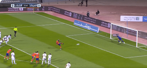 وتلقى اللاعب فواز الصقور لاعب الشباب بطاقة صفراء بالدقيقة الـ35 بعد احتساب ركلة جزاء للفريق البرتقالي.